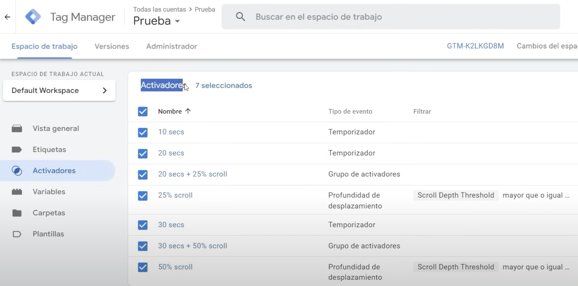 - Agrega las Acciones a Medir (Activadores): Dentro de GTM, vas a la sección «Activadores».