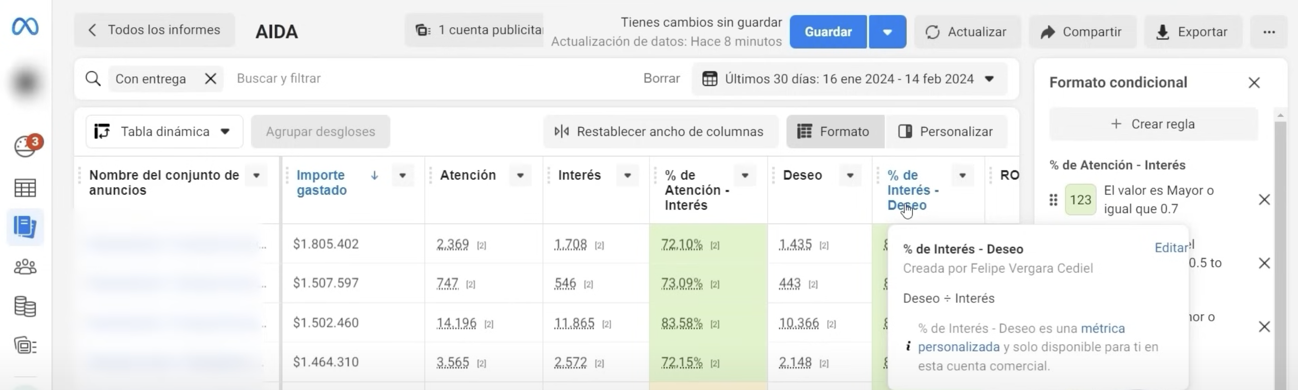 - Analizar tus Campañas: Puedes crear informes personalizados en el administrador de anuncios de Facebook para visualizar el «embudo AIDA» de tus campañas. Al ver cuántas personas pasan de la etapa de Atención a Interés y de Interés a Deseo, puedes identificar cuellos de botella. Por ejemplo, si muchas personas llegan a Atención pero pocas pasan a Interés, podría indicar un problema de tiempo de carga del sitio web o falta de congruencia entre el anuncio y la página de destino. Si pasan de Interés pero no llegan a Deseo, podría ser un problema con el contenido, precios o presentación del producto en la página.